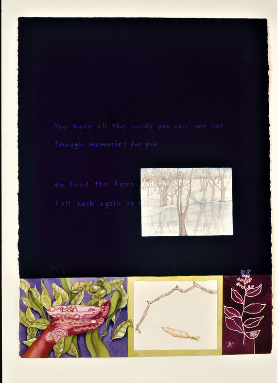 My pieces from the series The Poetic Response are works created in response to the poetry of Arizona poet Lois Roma-Deeley and others. I have been collaborating with Lois Roma-Deeley for now five years, and frequently respond to her work, or create work in collaborative dialogue with her. While many of my works have included text in the past, I have turned to contemporary poetry as a source of creative dialogue between image and text. Often, the poetry is included in the works as either fragments of text, or in its entirety. These works use and respond to poetic text to visually express ideas of vulnerability, fragility and the transitory nature of beauty. The works are shown with “headphones” on shelves, including the voice of the poet reading her work.